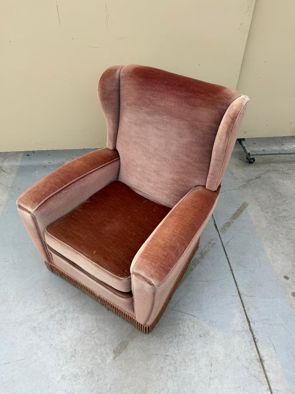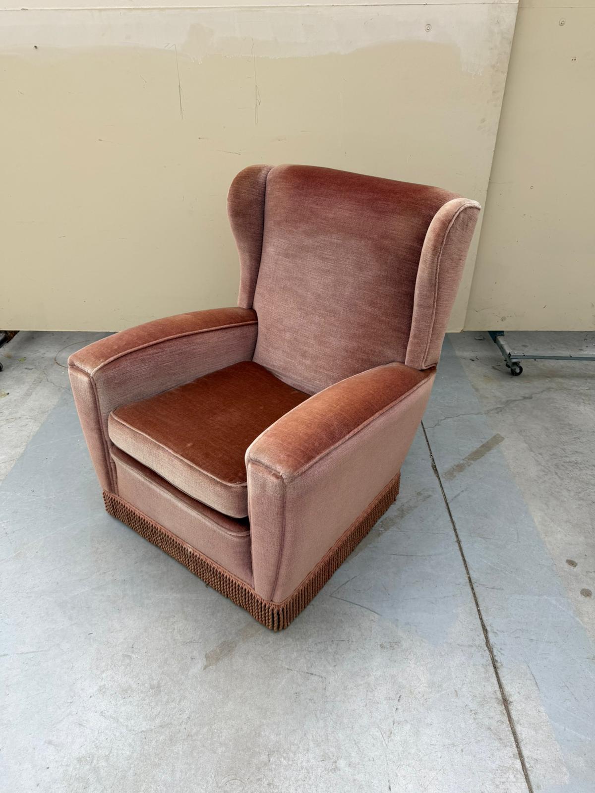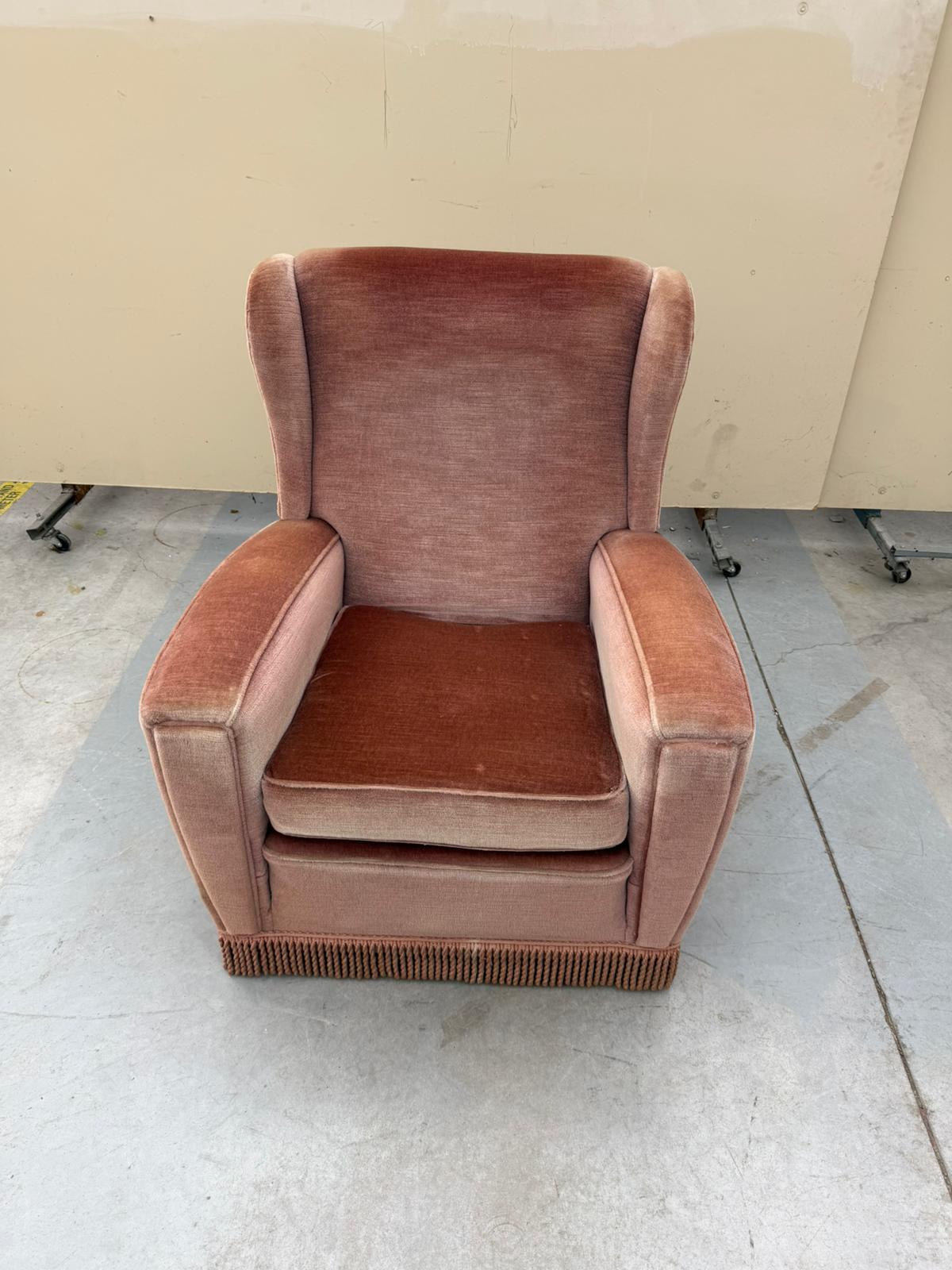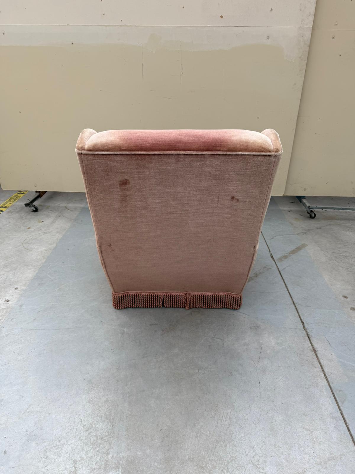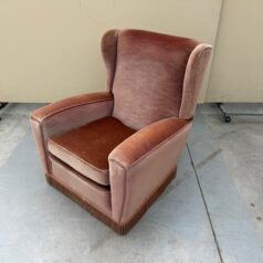 Rozā auduma atpūtas krēsls.
